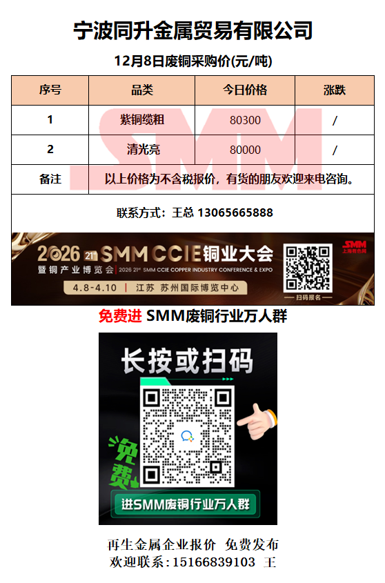今日同升金属 废铜采购报价已更新,有货的朋友欢迎联系我们!