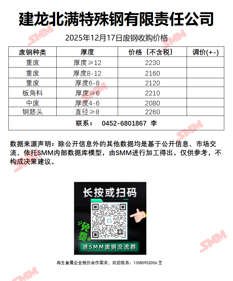 12月17日建龙北满钢铁 废钢收购报价