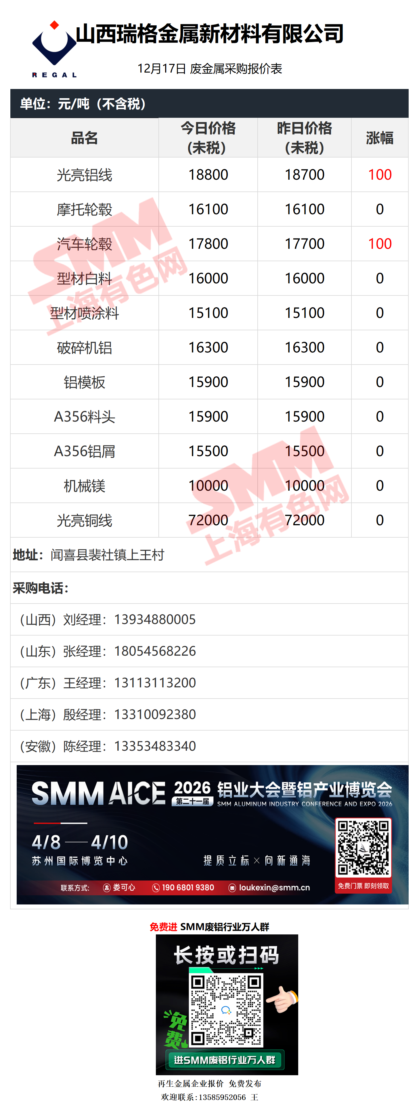 12月17日瑞格金属 废铝采购报价