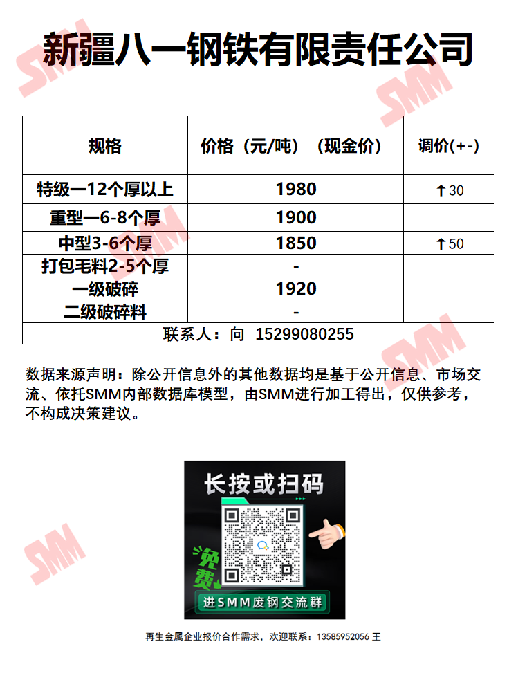 今日新疆八一钢铁 废钢收购报价已更新,有货的朋友欢迎联系我们!