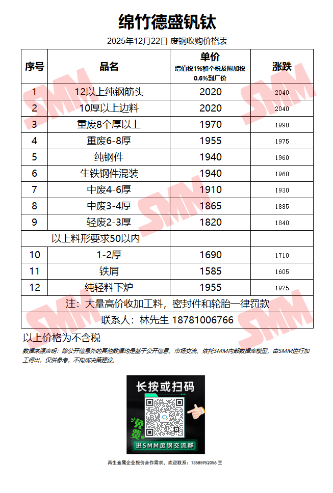 12月22日鑫泉钢铁(原绵竹金泉钢铁) 废钢采购报价