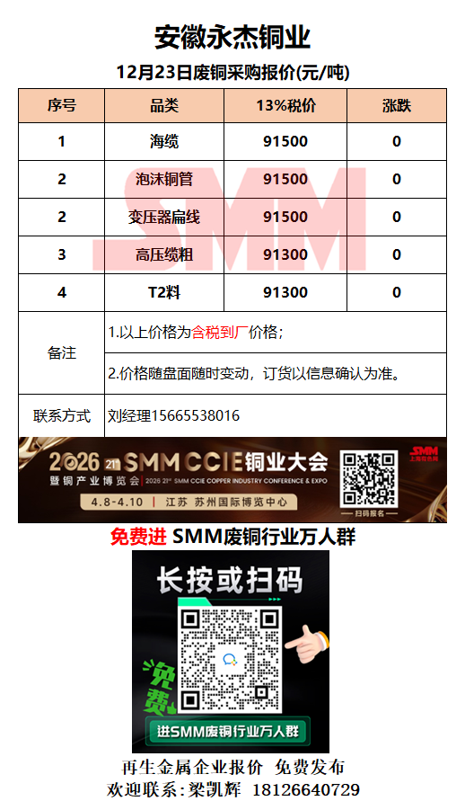 今日安徽永杰 废铜采购报价已更新,有货的朋友欢迎联系我们!