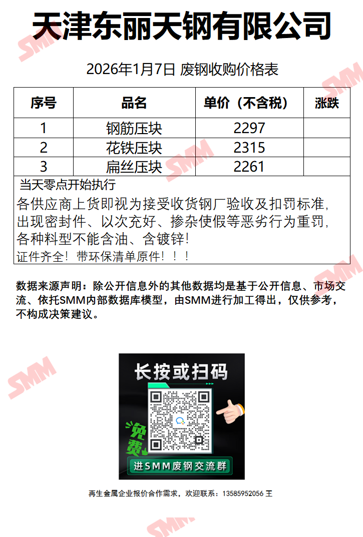 1月7日天津东丽天钢 废钢收购报价
