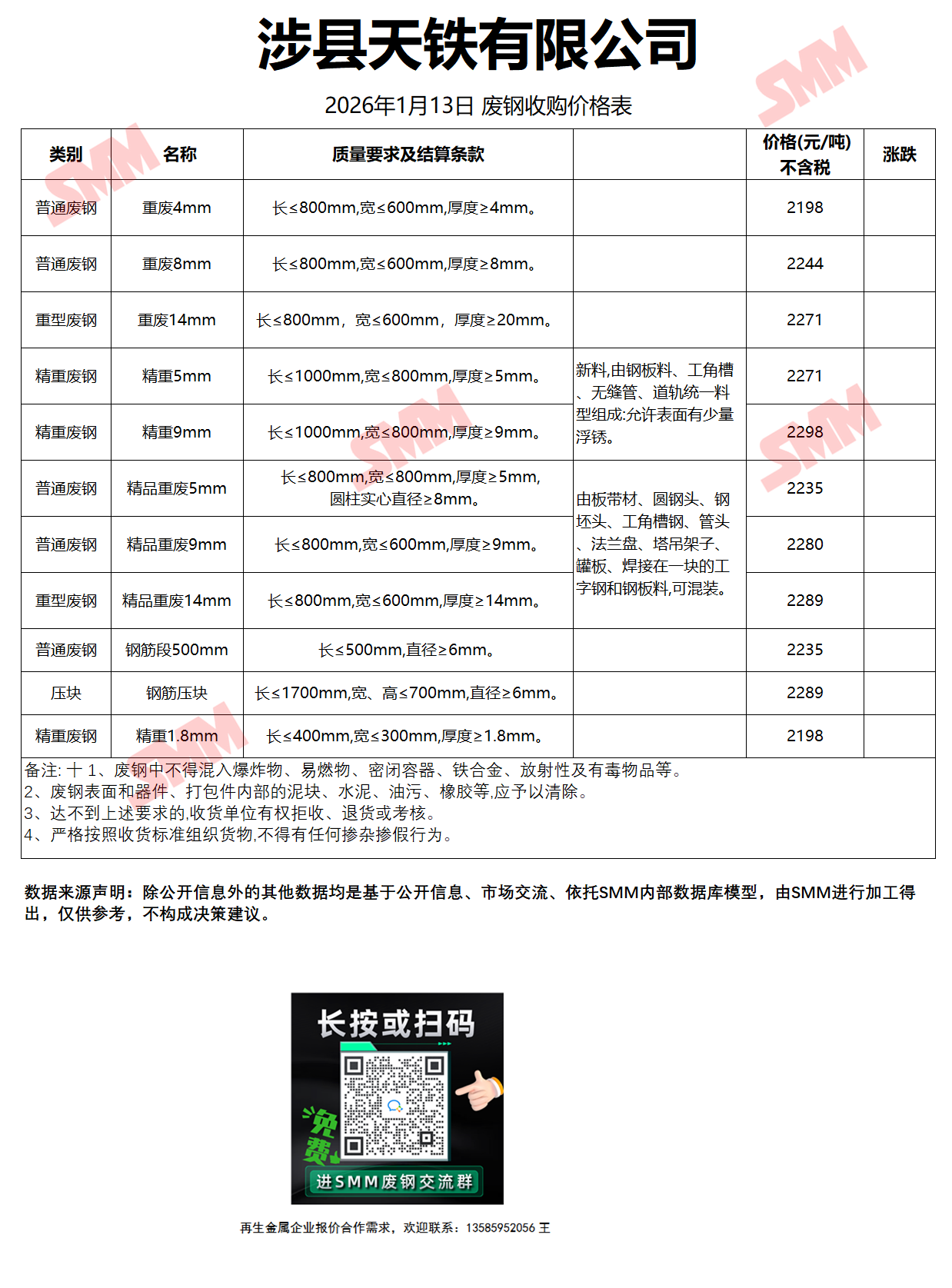1月13日涉县天铁 废钢收购报价