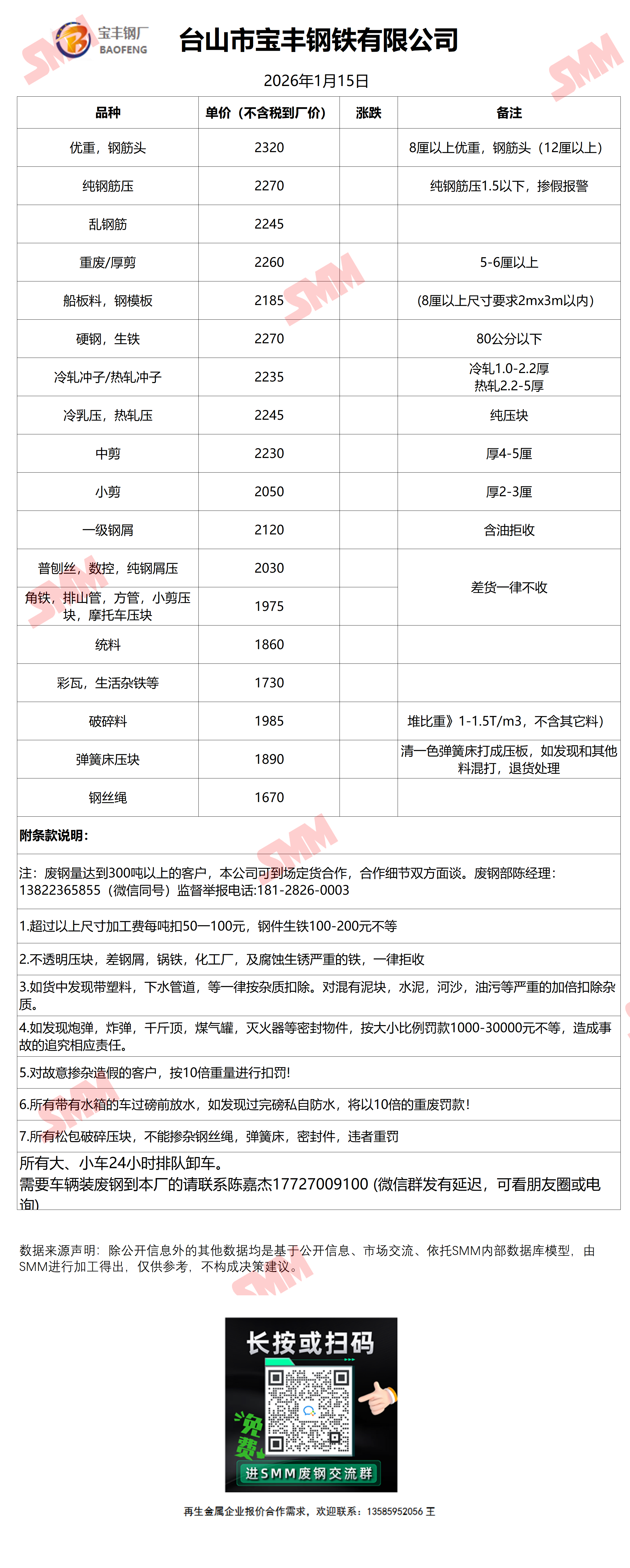 1月15日宝丰钢铁 废钢收购报价