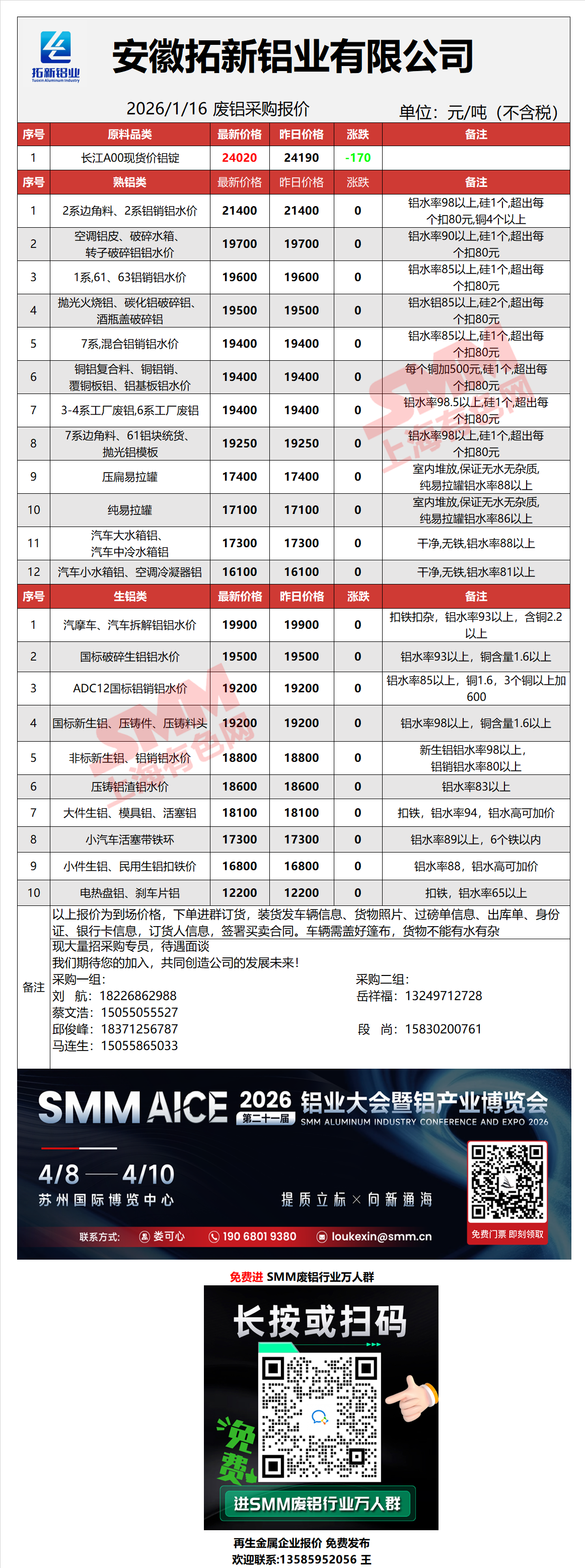 1月16日拓新铝业 废铝采购报价