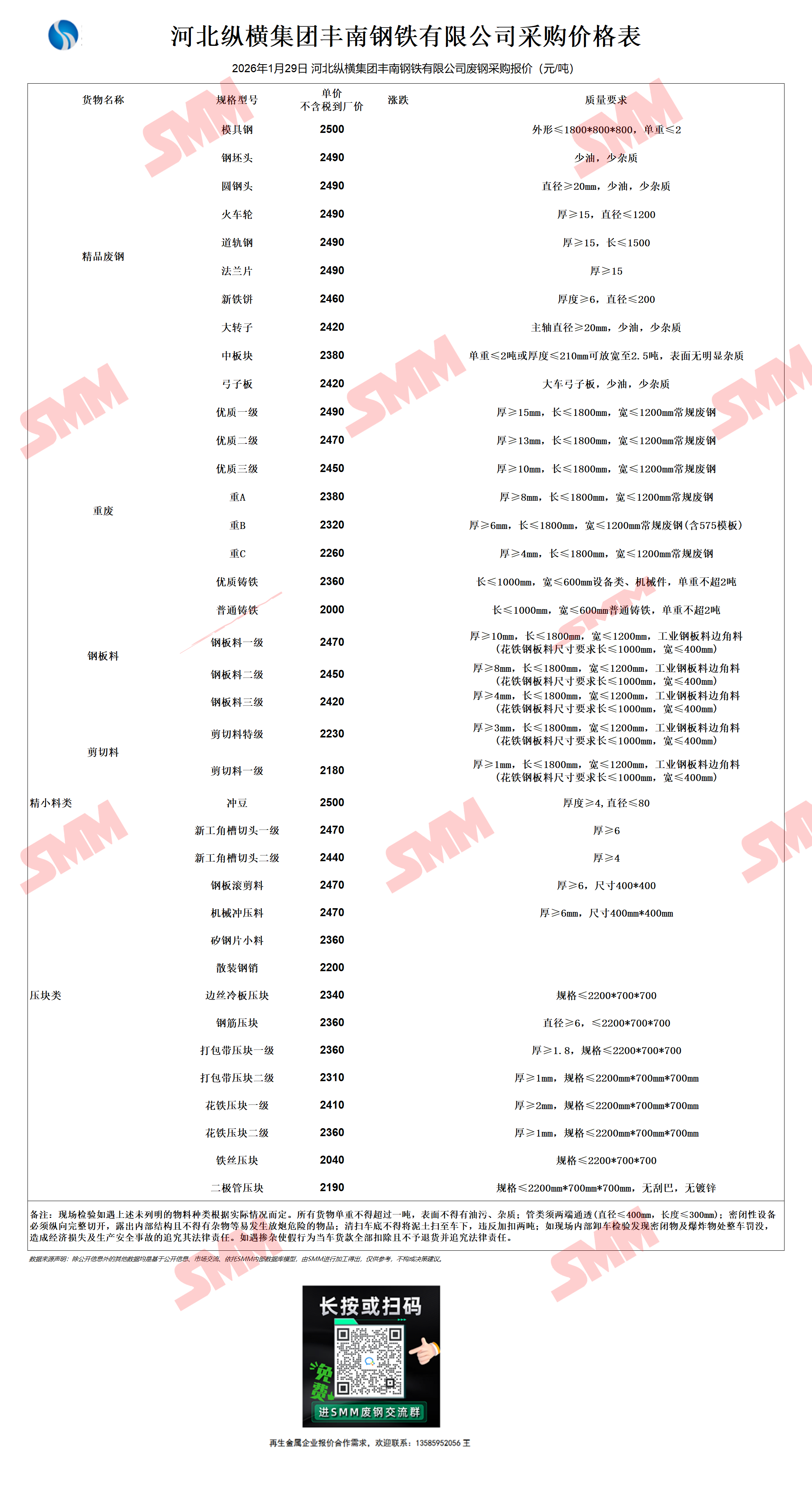 1月29日河北纵横集团丰南钢铁 废钢采购报价