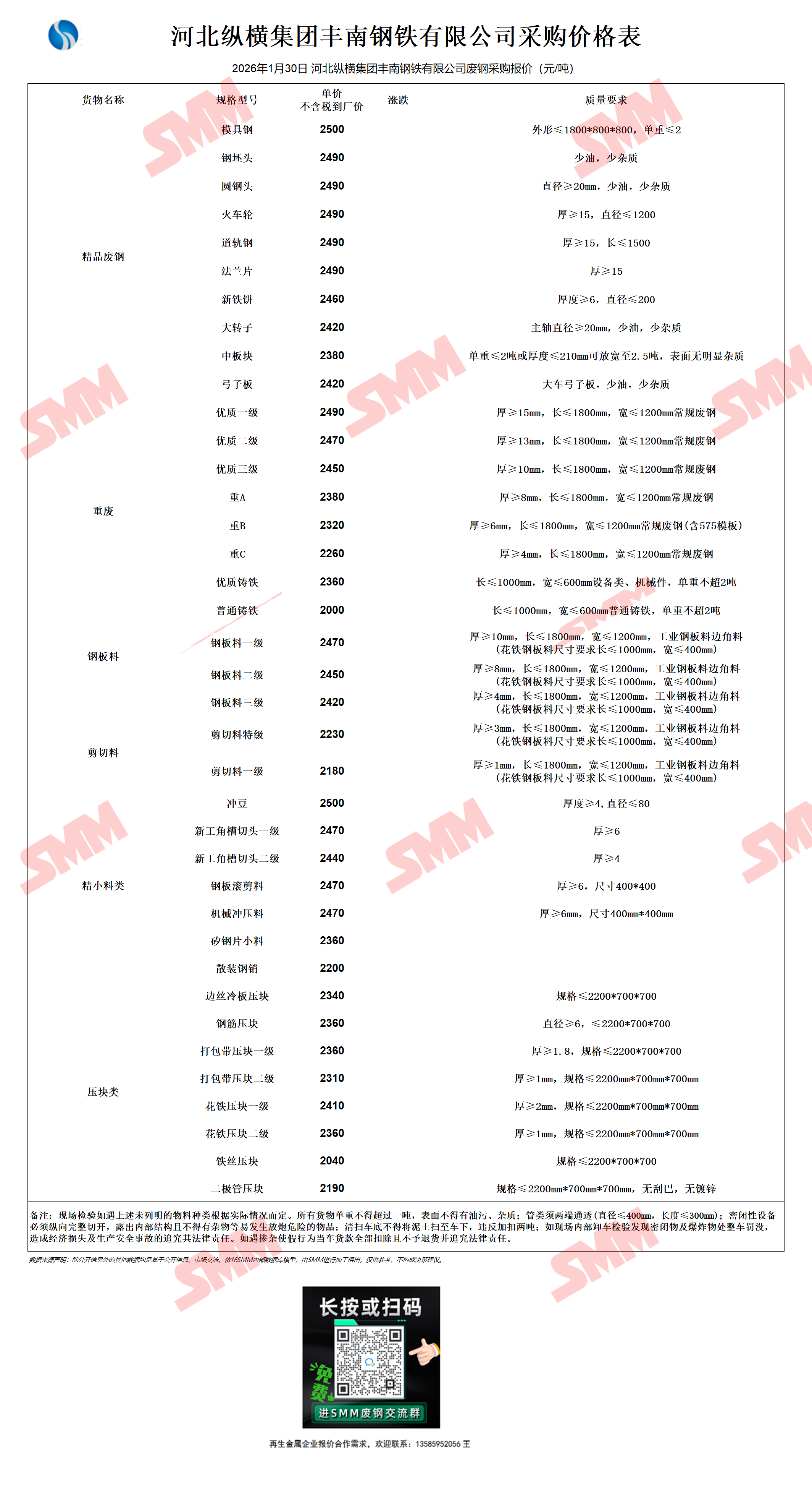 1月30日河北纵横集团丰南钢铁 废钢采购报价