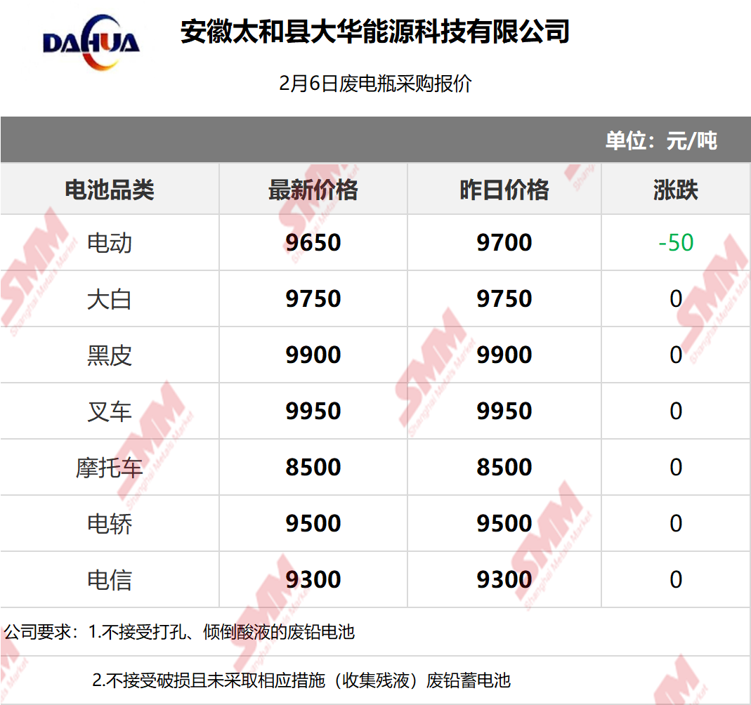 2月6日安徽大华 废电瓶采购报价