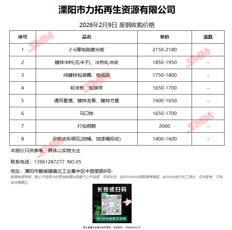 2月9日溧阳市力拓再生 废钢收购报价