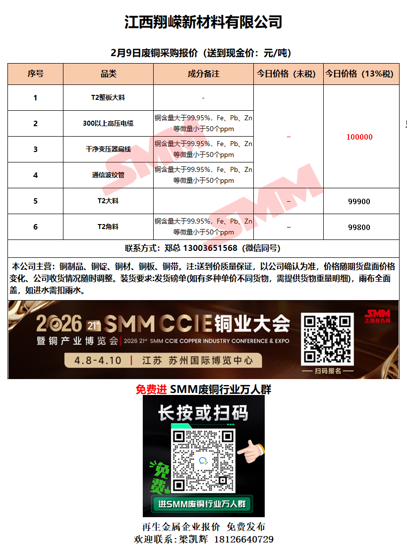 2月9日江西翔嵘新材料 废铜采购报价