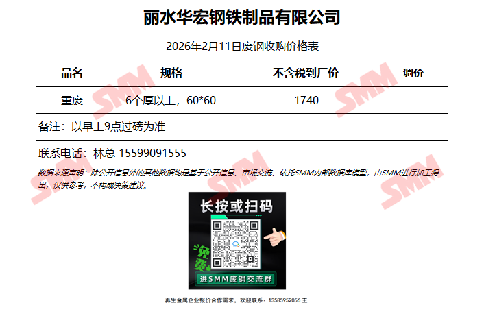 2月11日丽水华宏 废钢收购报价