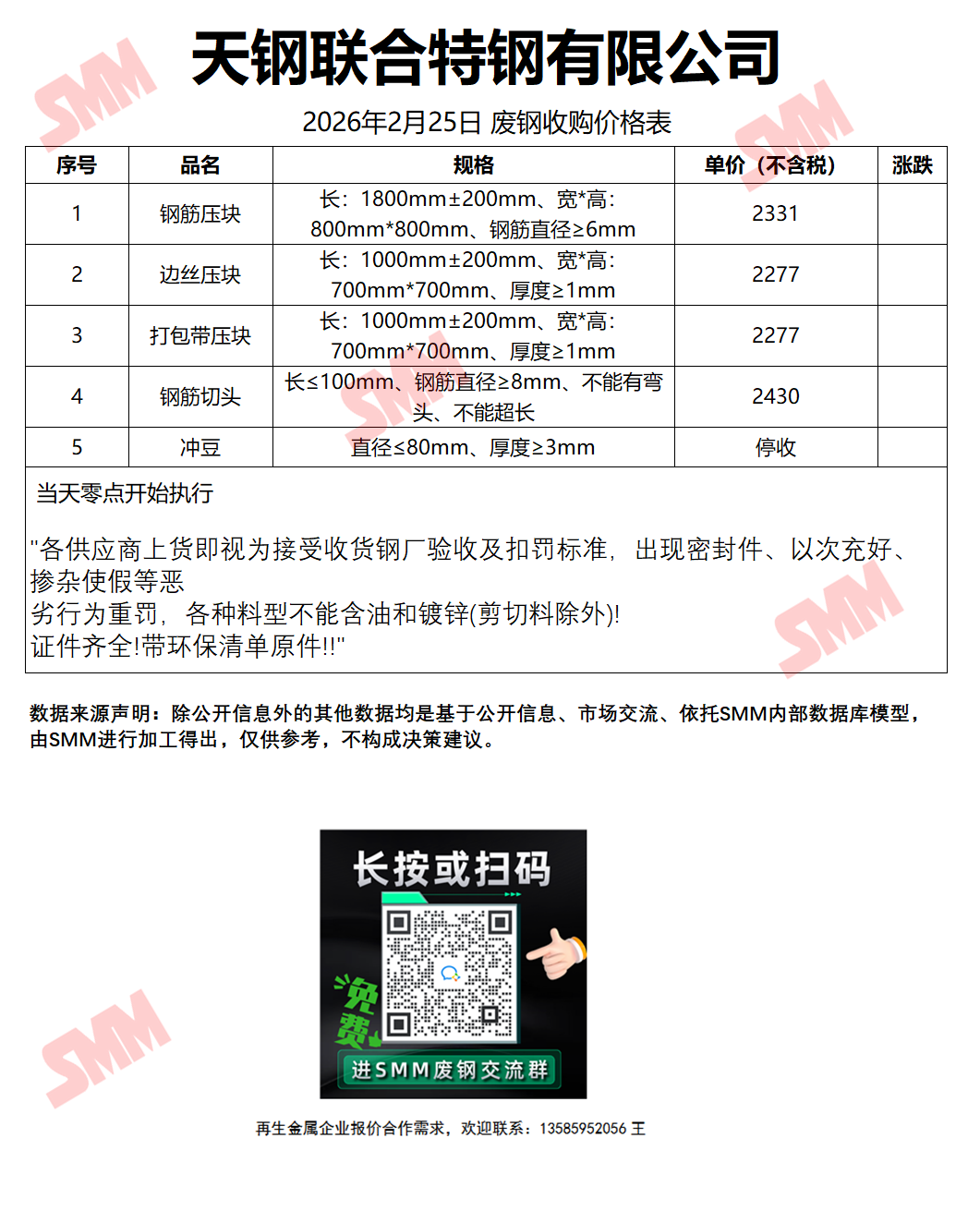 今日天钢联合特钢 废钢收购报价已更新,有货的朋友欢迎联系我们!