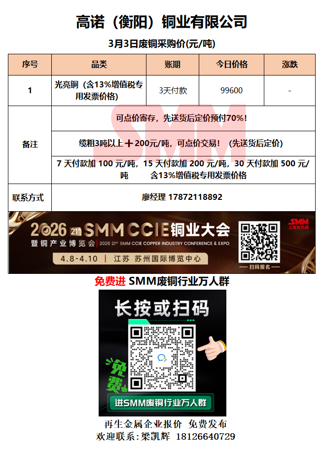 3月3日高诺(衡阳)铜业 废铜采购报价
