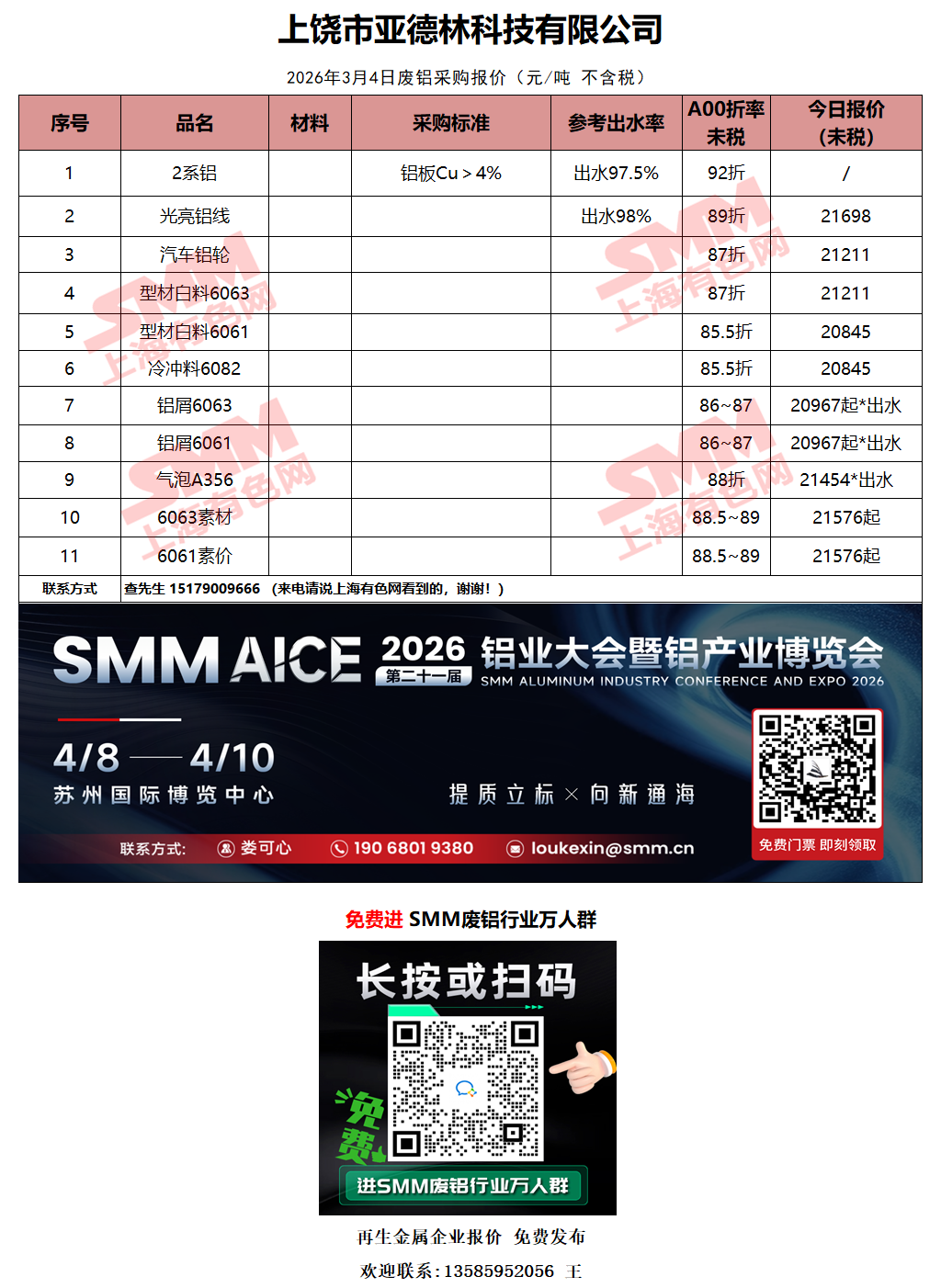 3月4日上饶市亚德林 废铝采购报价