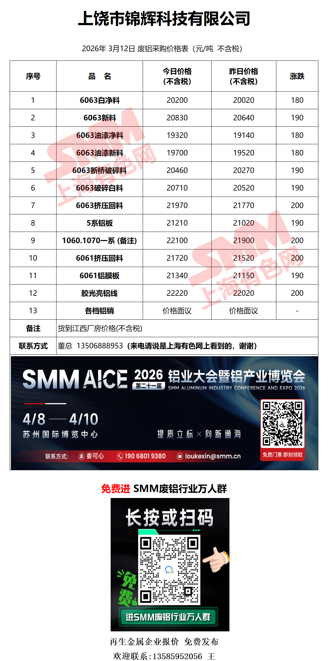 3月12日上饶锦辉 废铝采购报价