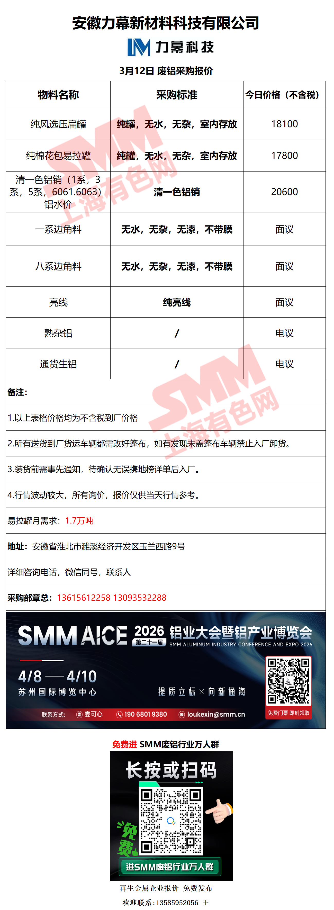 今日安徽力幕 废铝采购报价已更新,有货的朋友欢迎联系我们!
