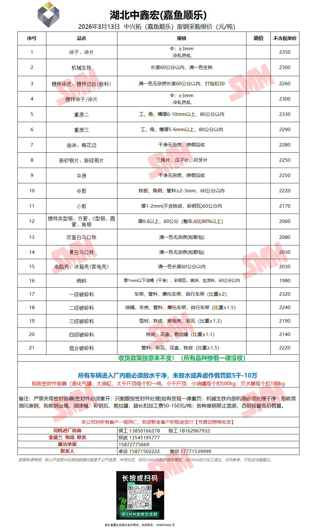 3月13日湖北中兴拓(嘉鱼金盛兰) 废钢采购报价