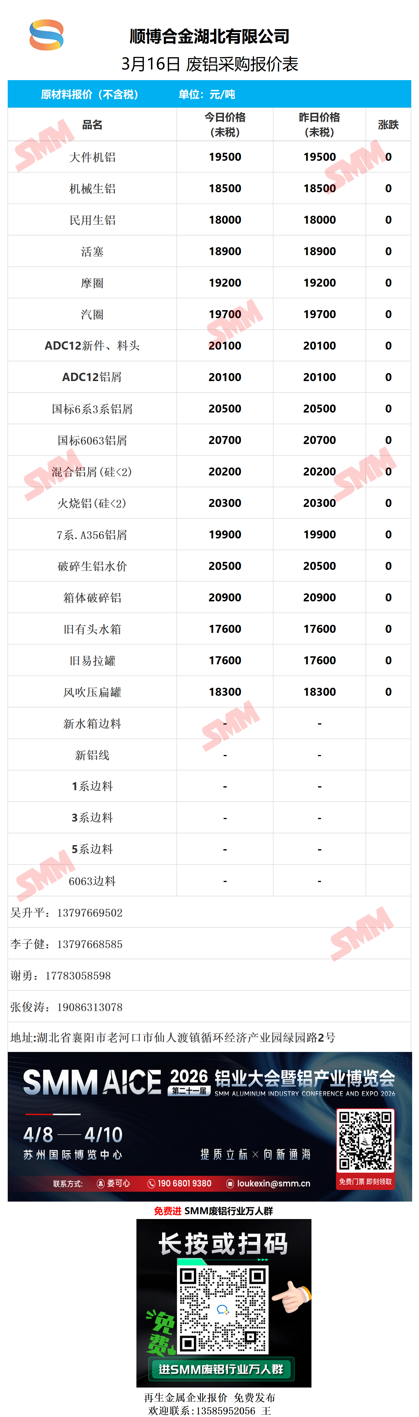 3月16日顺博合金湖北 废铝采购报价