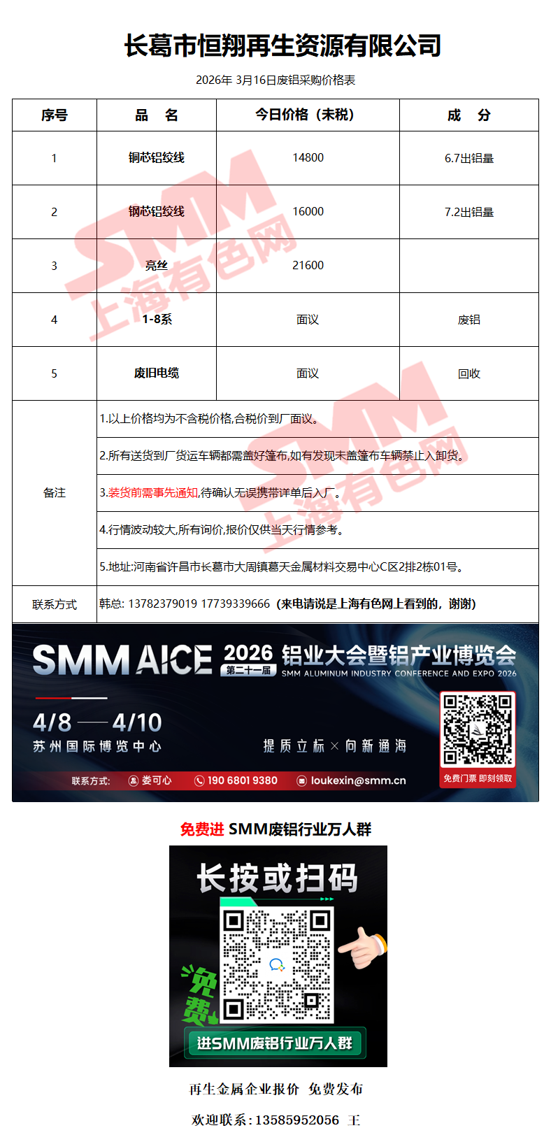 3月16日长葛恒翔 废铝采购报价