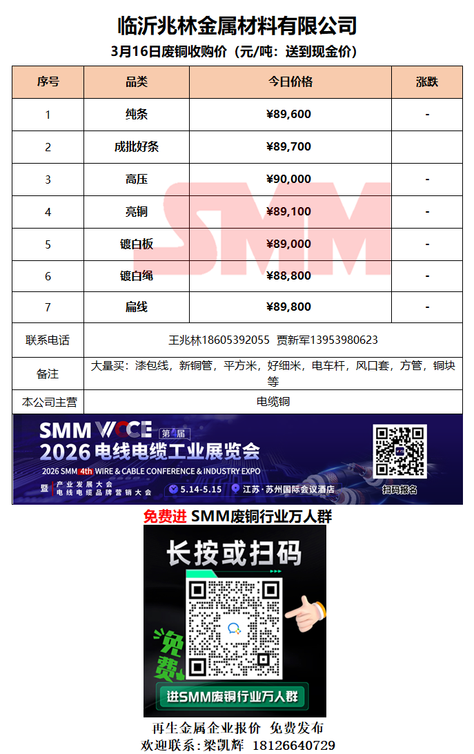 3月16日临沂兆林金属 废铜采购报价
