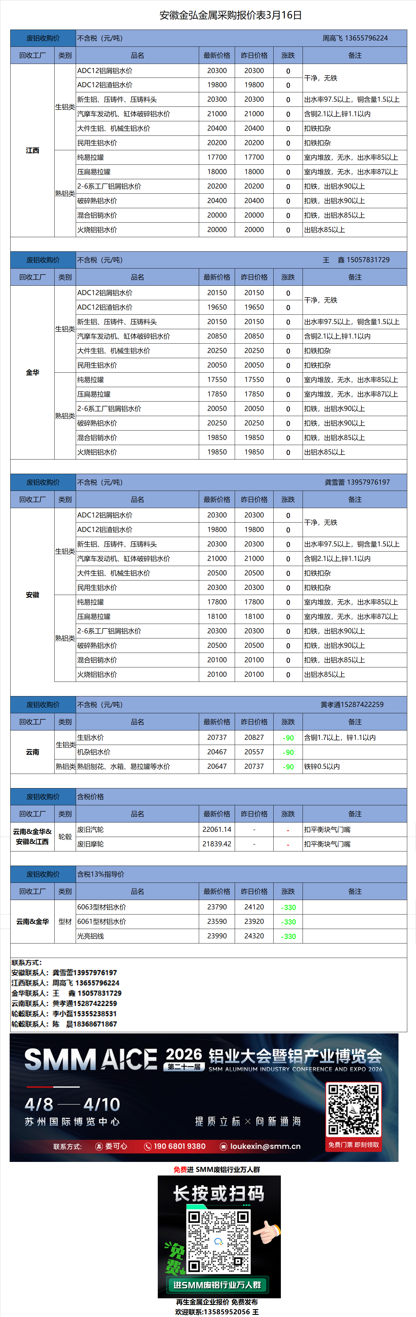 今日安徽金弘 废铝采购报价已更新,有货的朋友欢迎联系我们!
