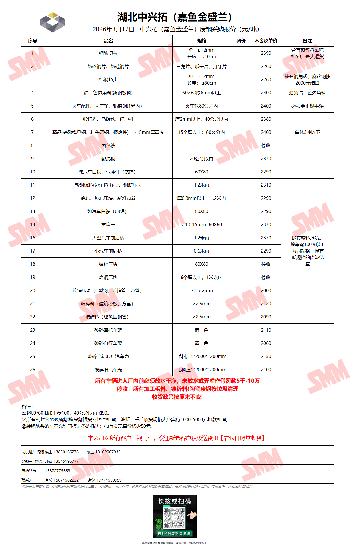 3月17日湖北中兴拓(嘉鱼金盛兰) 废钢采购报价