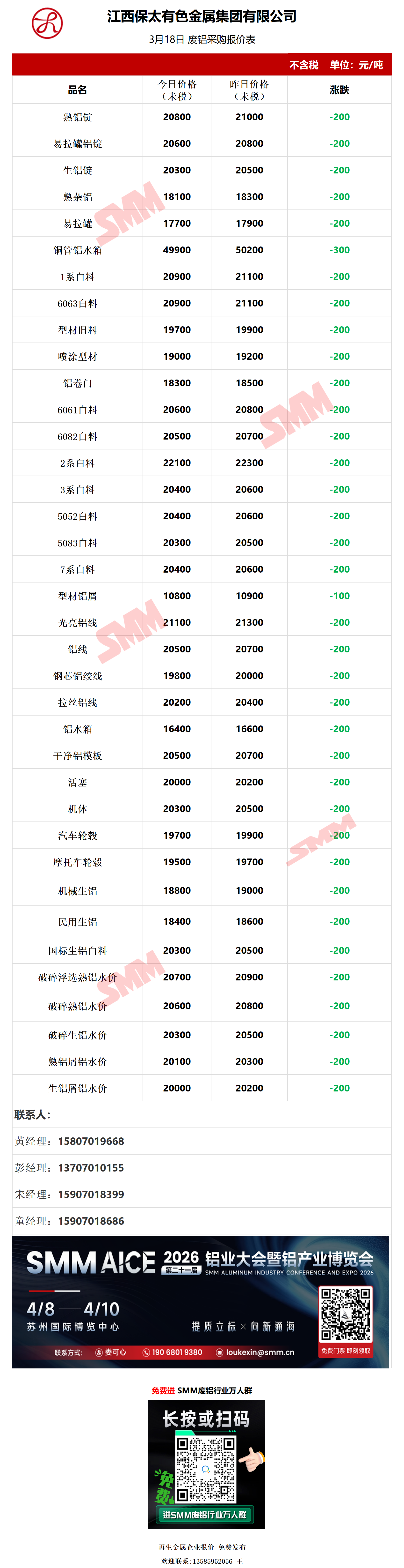 今日江西保太 废铝采购报价已更新,有货的朋友欢迎联系我们!