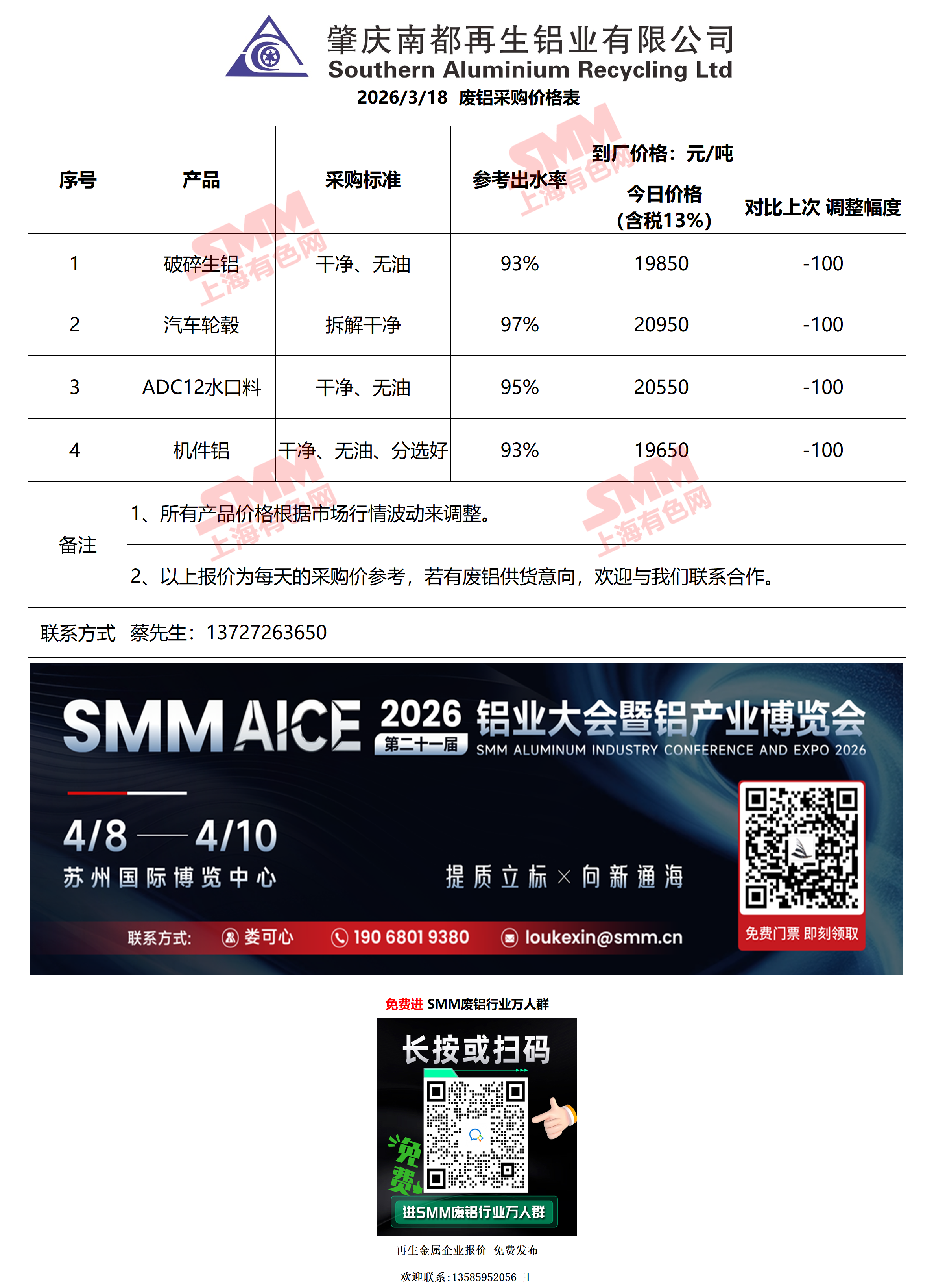 3月18日南都再生铝业 废铝采购报价
