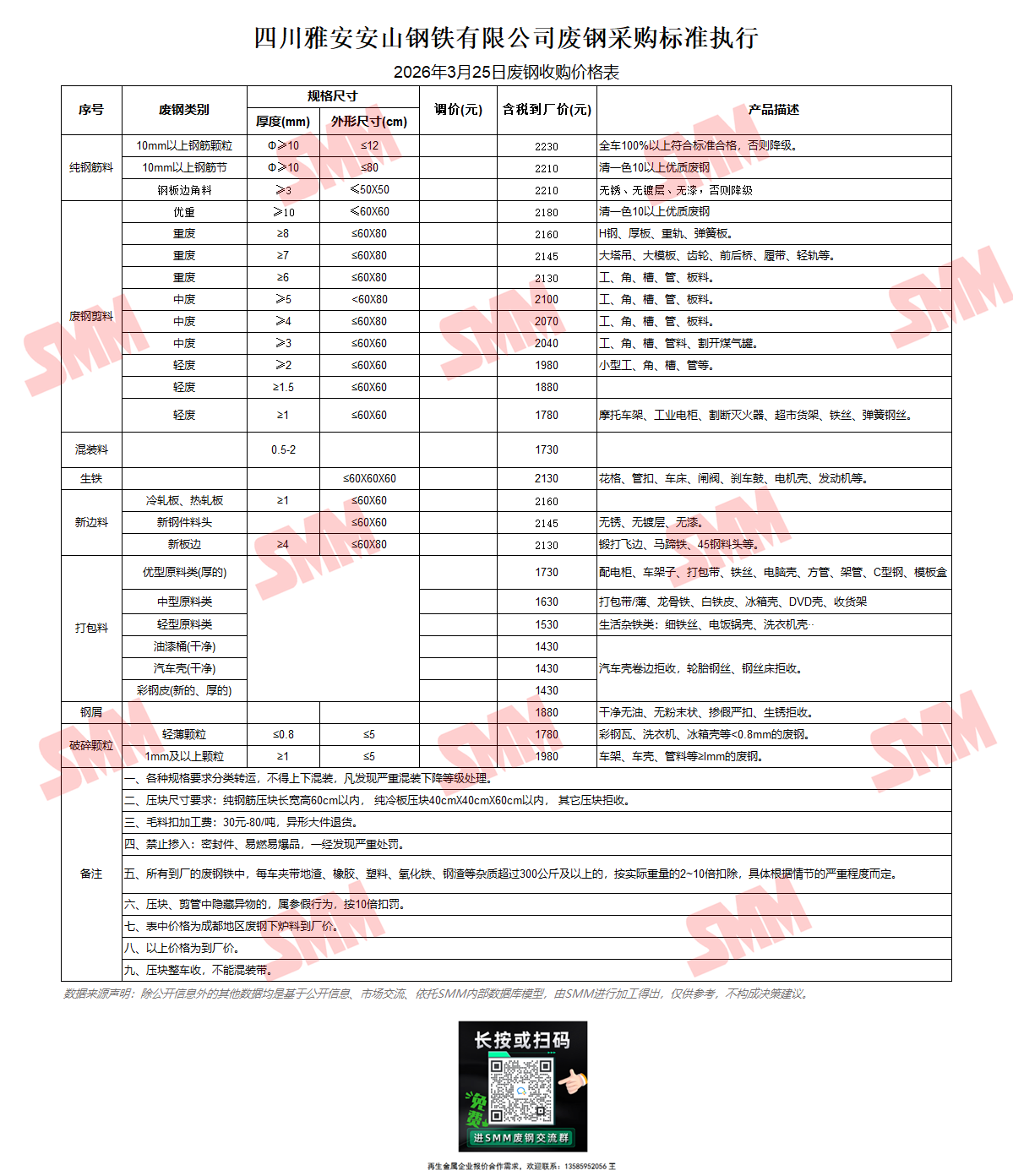 3月25日鑫泉钢铁(原绵竹金泉钢铁) 废钢采购报价