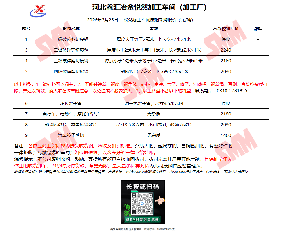 3月25日河北鑫汇冶金悦然加工车间 废钢采购报价