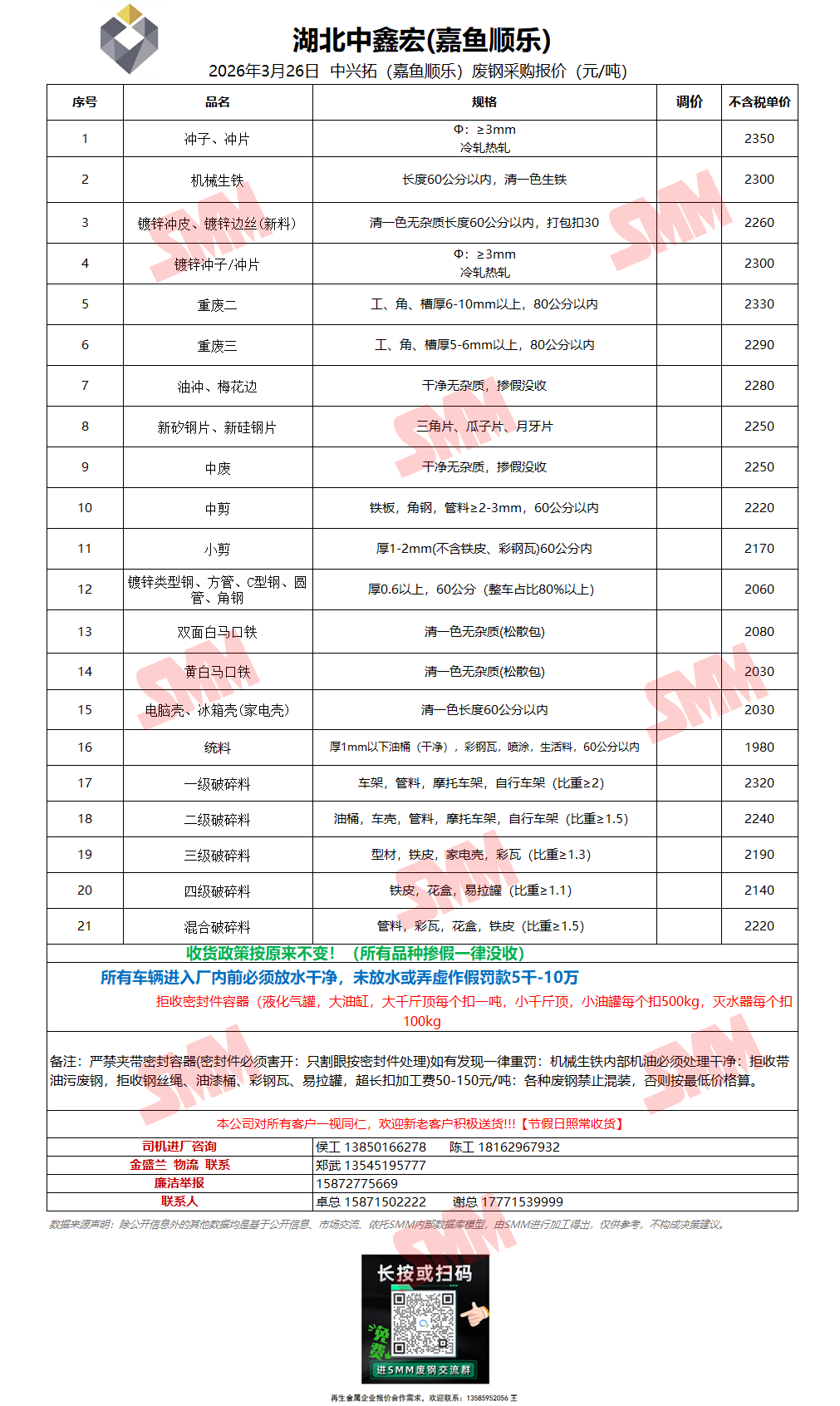 3月26日湖北中兴拓(嘉鱼金盛兰) 废钢采购报价