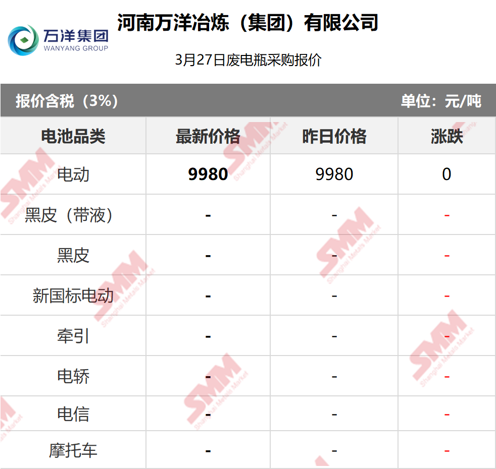 SMM 2026/3/27 国内知名再生铅企业废电瓶采购报价