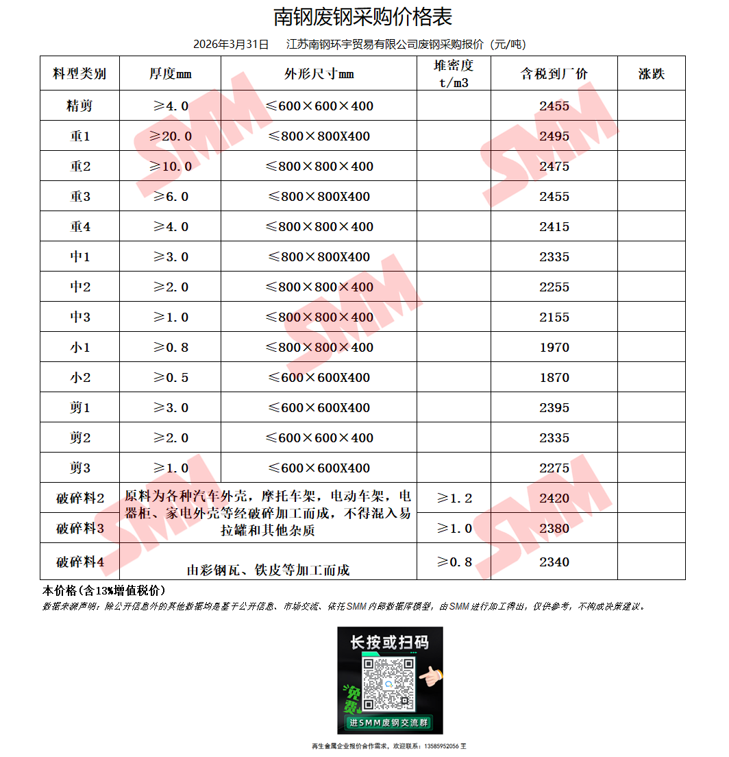 3月31日江苏鸿泰钢铁 废钢收购报价