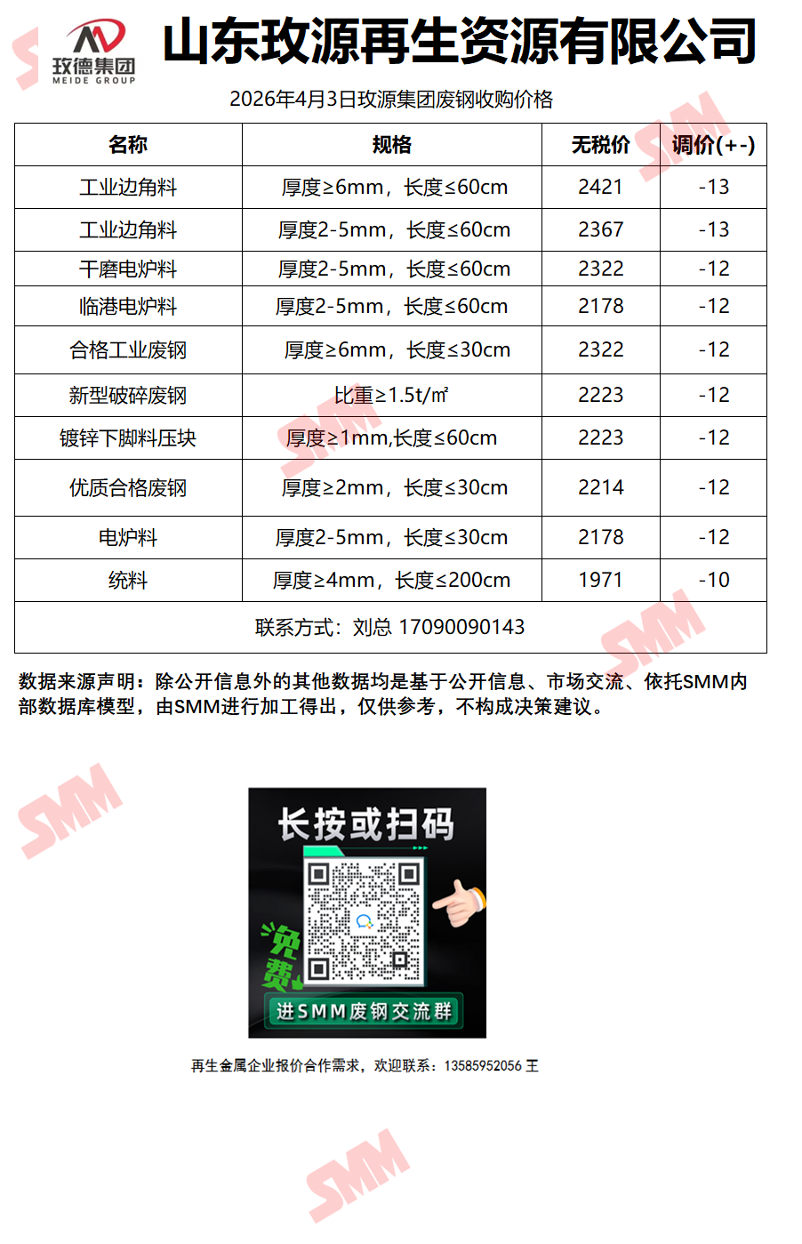 今日山东玫源再生 废钢收购报价已更新,有货的朋友欢迎联系我们!