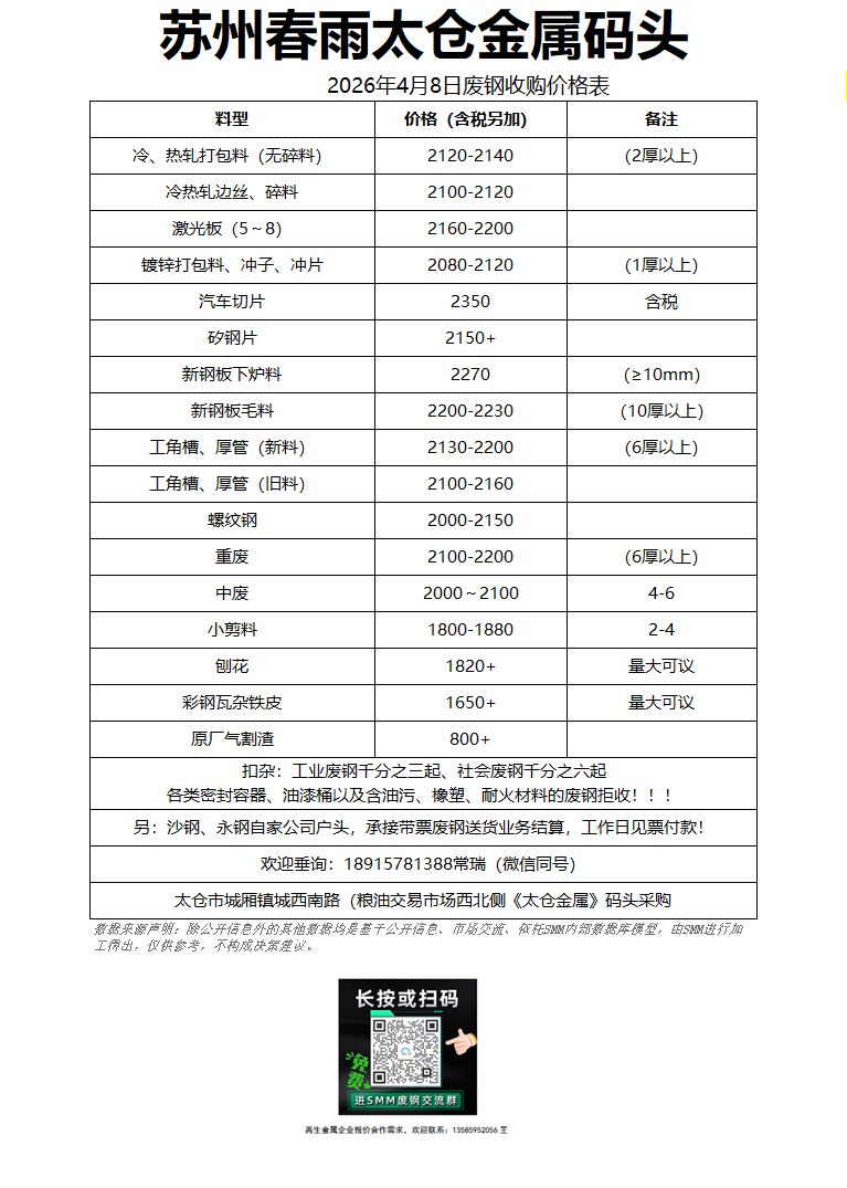 4月8日苏州春雨 废钢收购报价