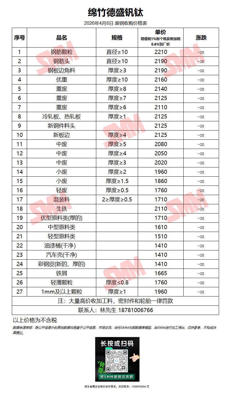 4月8日10时 绵竹德盛钒钛 废钢收购报价