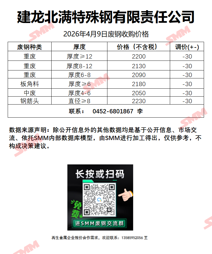 4月9日建龙北满钢铁 废钢收购报价