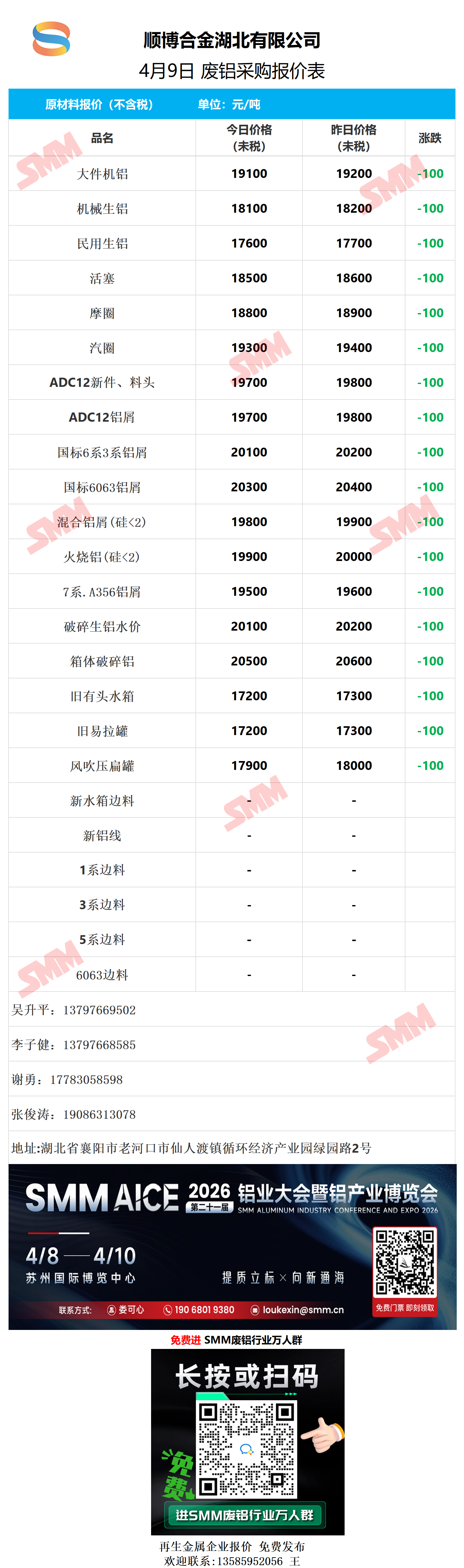 今日顺博合金湖北 废铝采购报价已更新,有货的朋友欢迎联系我们!