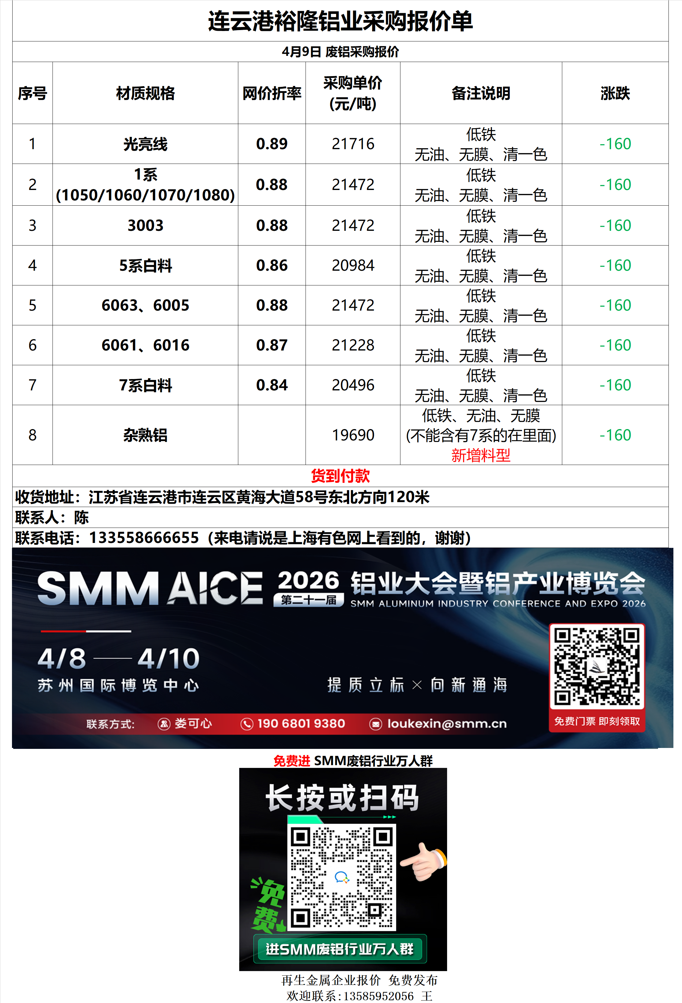 今日连云港裕隆 废铝采购报价已更新,有货的朋友欢迎联系我们!