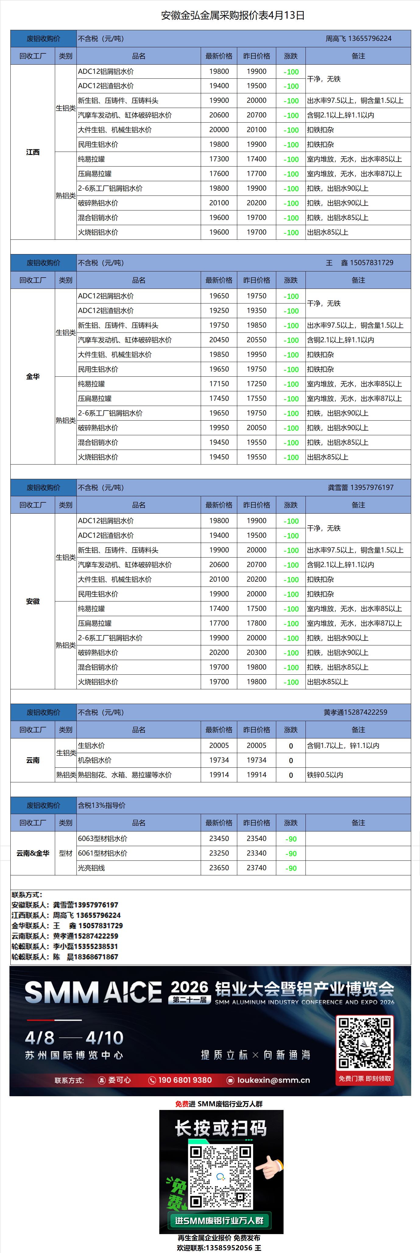 今日安徽金弘 废铝采购报价已更新,有货的朋友欢迎联系我们!