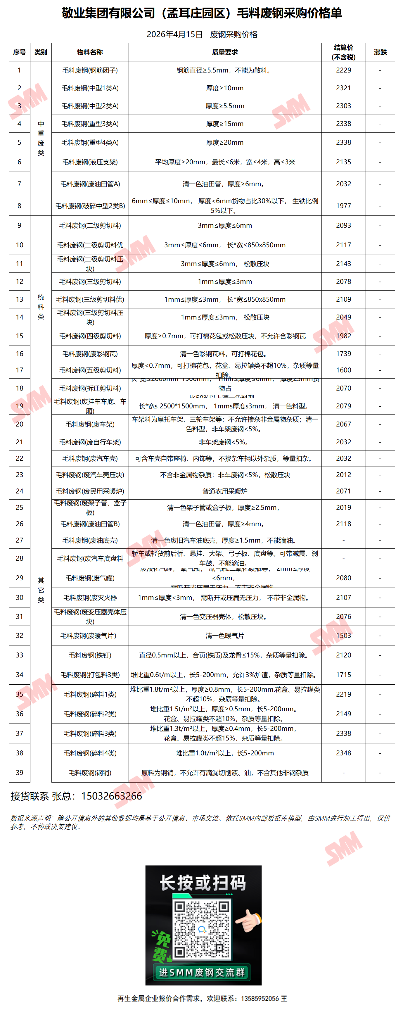 4月15日敬业钢铁(孟耳庄园区) 废钢采购报价
