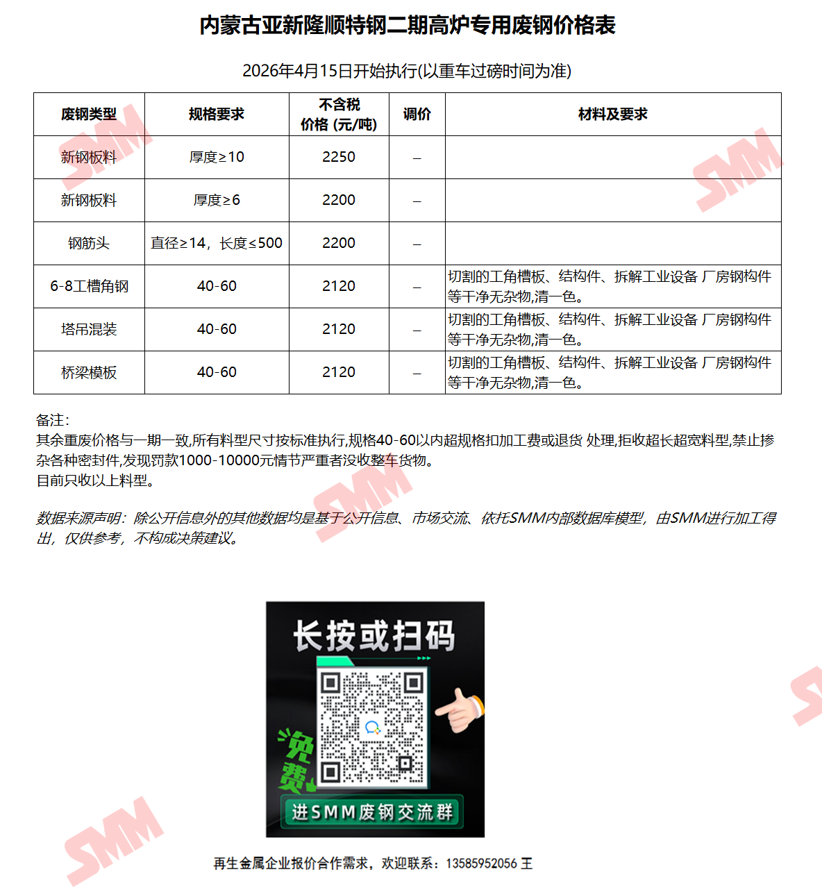 4月15日内蒙古亚新隆顺特钢二期 废钢收购报价