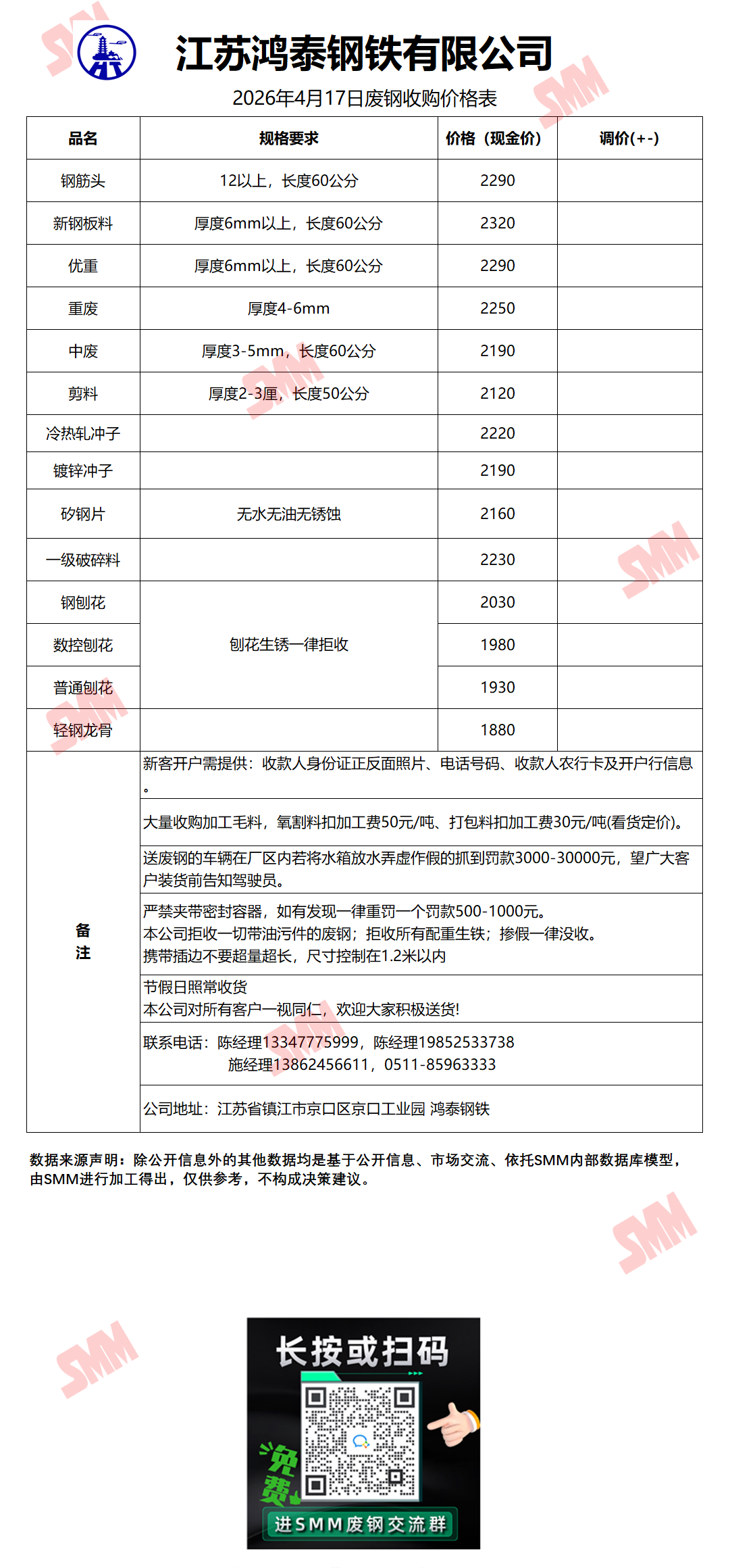 4月17日江苏鸿泰钢铁 废钢收购报价