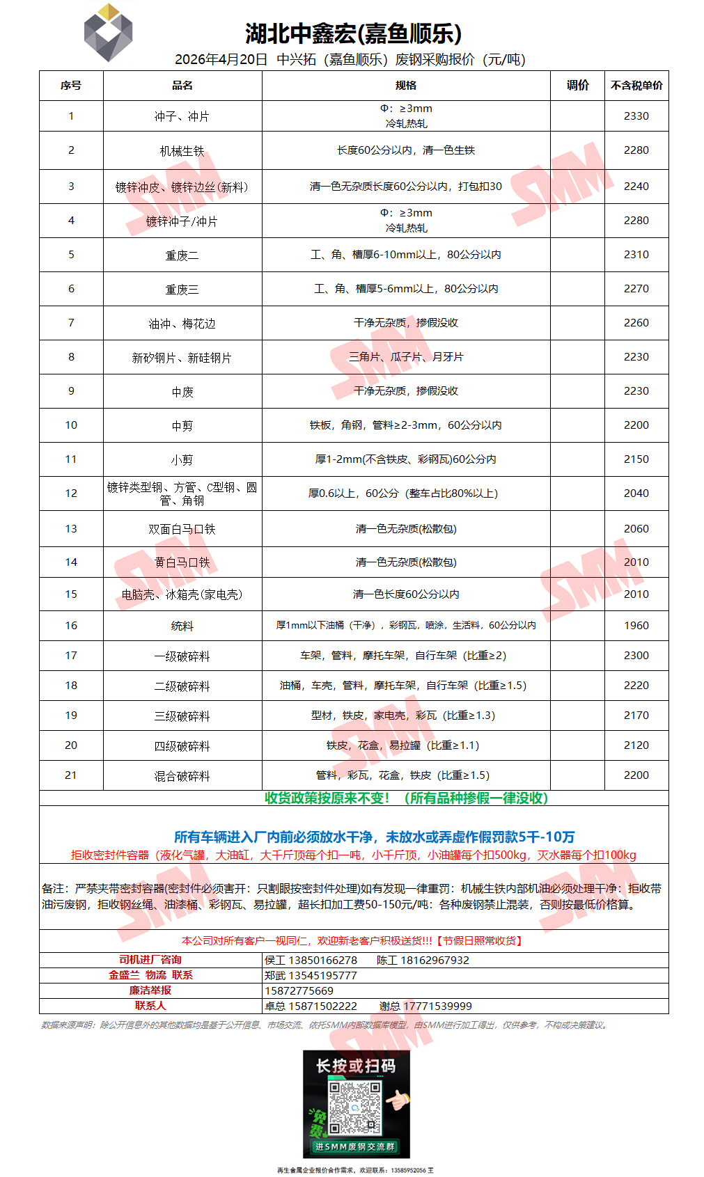 4月20日湖北中鑫宏(嘉鱼顺乐) 废钢采购报价