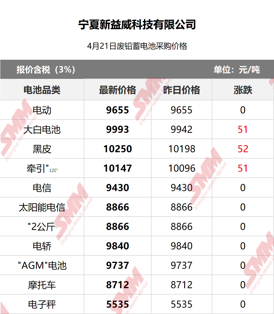 SMM 2026/4/21 国内知名再生铅企业废电瓶采购报价