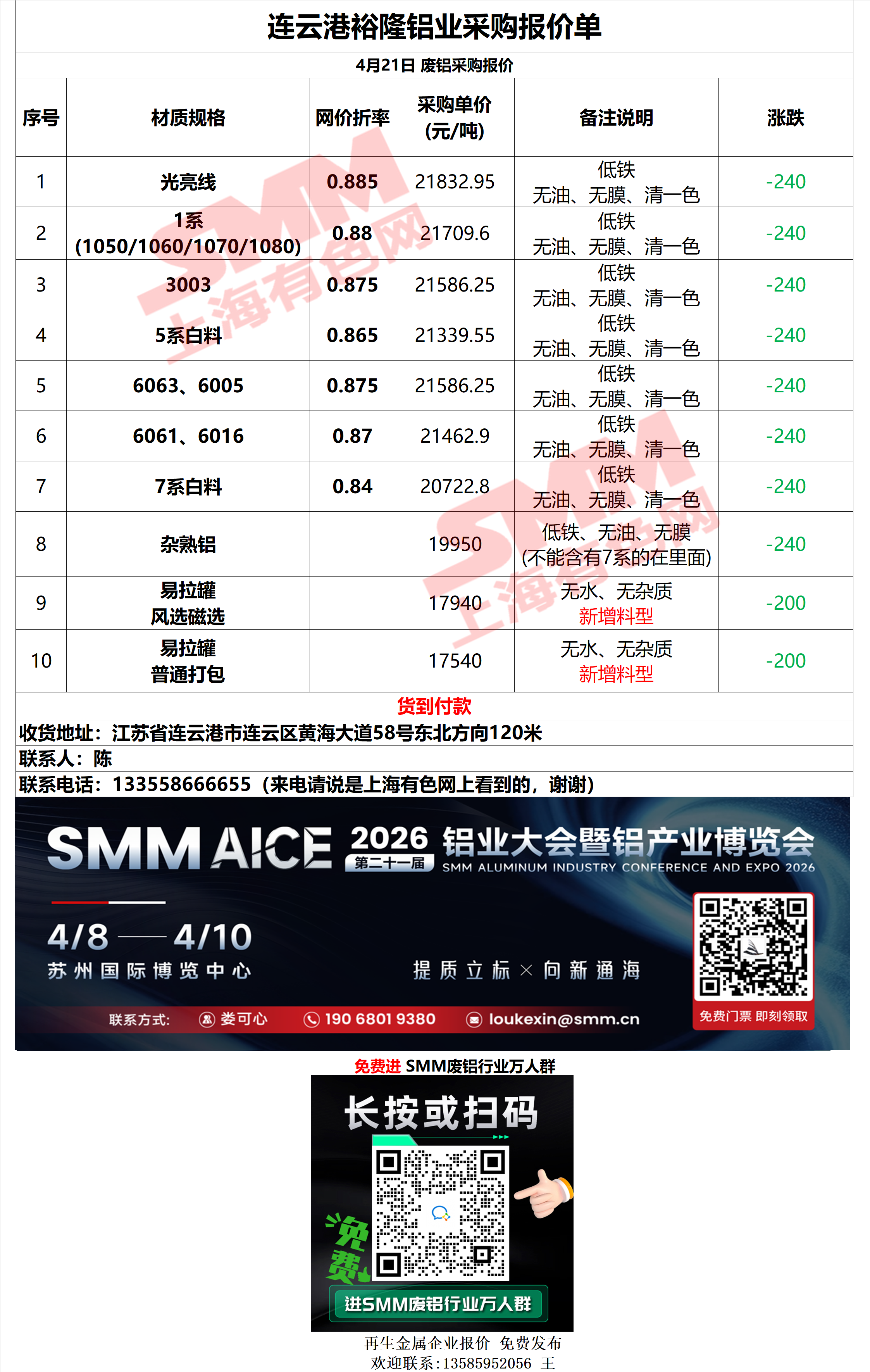 4月21日上海沪闽&福建沪鑫 废铝采购报价