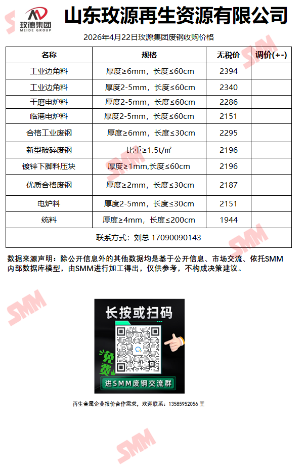 4月22日山东玫源再生 废钢收购报价