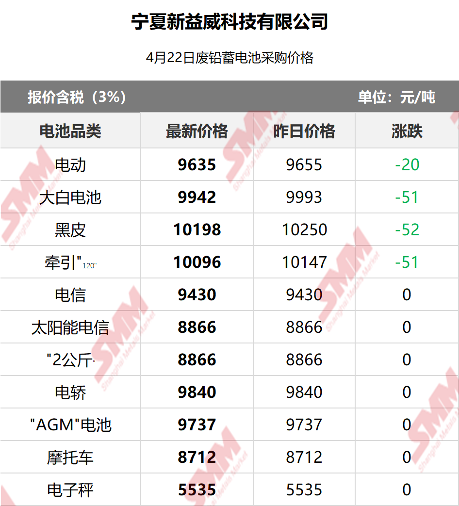 SMM 2026/4/22 国内知名再生铅企业废电瓶采购报价