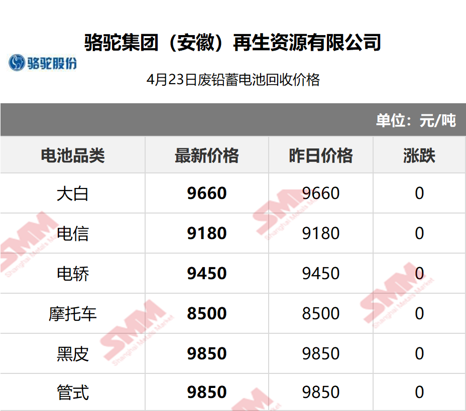SMM 2026/4/23 国内知名再生铅企业废电瓶采购报价
